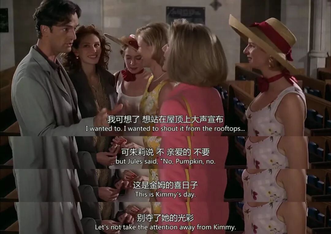 《我最好朋友的婚礼》,原意指的婚礼是Michael的,Jules是“最好的朋友”,但是,另外一层隐藏的意思是:Jules本身期待了一个婚礼,但是她“最好的朋友”,基佬George,让她明白了,她要学会放手,要学会有自己的人生。