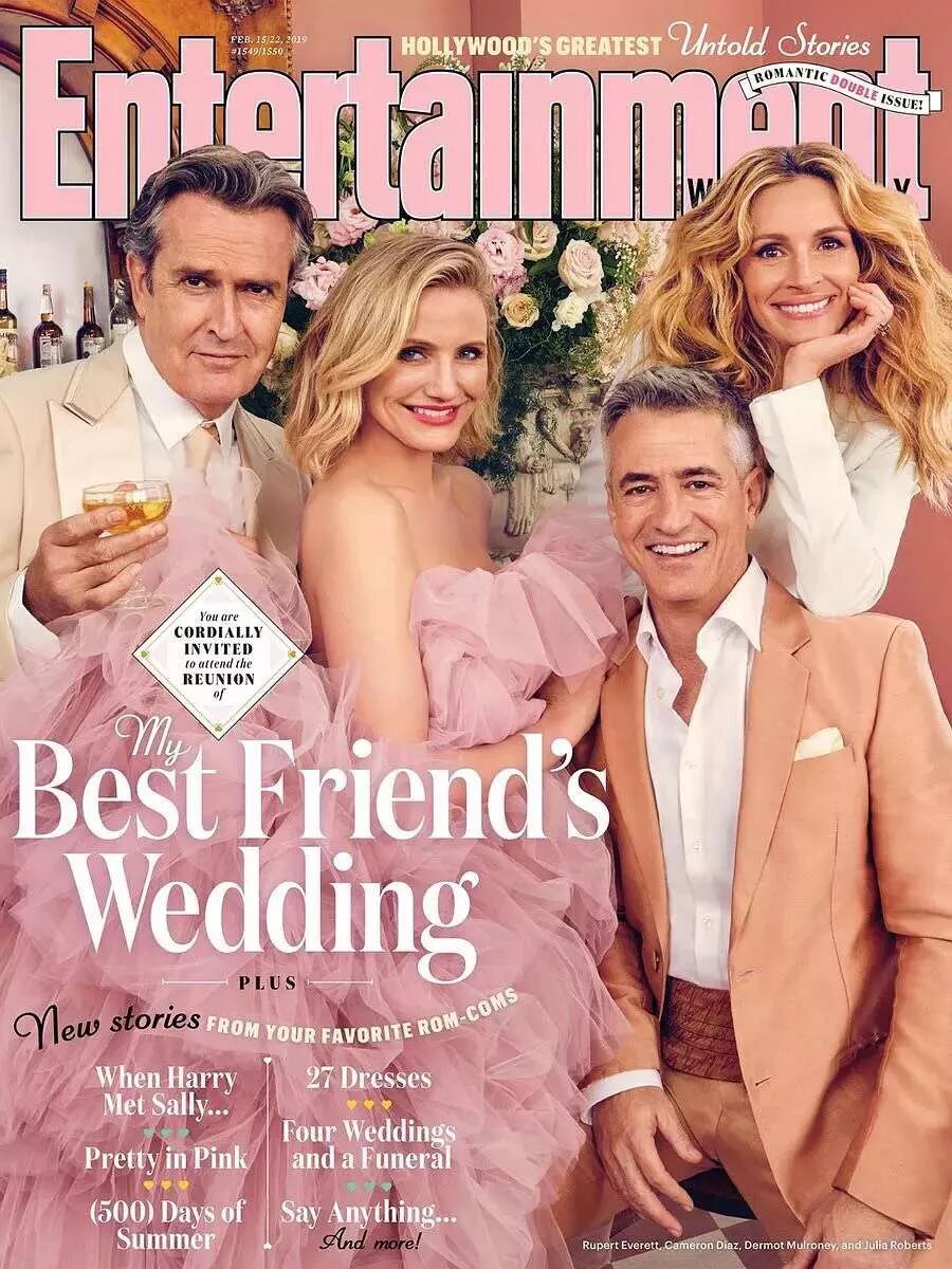 为了配合情人节的主题,《娱乐(Entertainment)》杂志的二月刊封面找来了My Best Friend`s Wedding(《我最好朋友的婚礼》)的四位主演重聚。岁月对于美人们似乎分外仁慈,浪漫粉色主题的封面上,四个人的颜值和气质都在,一点看不出,距离这部电影上映的1997年,已经过去22年了。