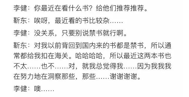 2015年,在北京人大举办的座谈会尾声时,有同学请台上李健、靳东二位推荐一些在读书目。