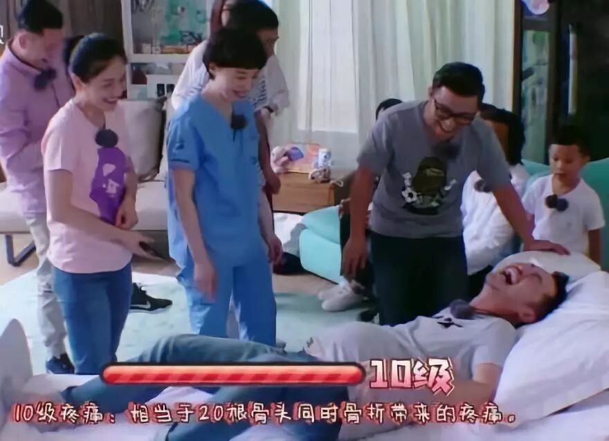当阵痛级别被调到2级时,沙溢就已经吓得嗷嗷大叫,4级时,沙溢眉毛拧成一团,捂着肚子疼到满头大汗,8级时,他早已痛到脸部扭曲变形,呼吸都变得急促起来,而当被问及要不要继续往上加时,沙溢已经疼到无法动弹,甚至连话也说不出,只能战战兢兢地摆手示意受不了了,千万别再加了。