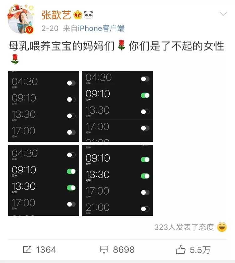 前几天,刚做了妈妈不久的张歆艺,在微博上晒出了一张“泵奶闹铃”的截图: