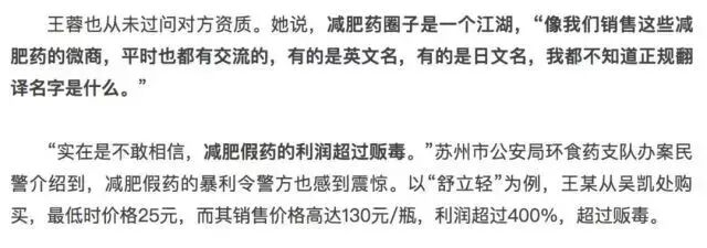苏州市公安局民警感叹:“实在不敢相信,减肥假药的利润超过贩..毒。”