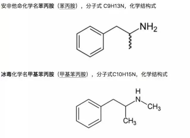 从结构式看,“冰.毒”只是将氨基上面一个氢键换成了甲基。