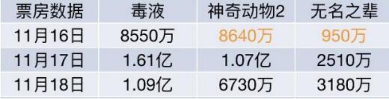 比如备受好评的《无名之辈》,票房和同期上映的《毒液》、《神奇动物2》差距几乎有10倍。