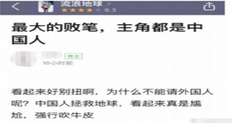 比如说《流浪地球》中,在各个国家都撤退的情况下,居然是中国人一直在坚持,而且拯救了世界,而不是美国,这个牛皮吹得太大了!