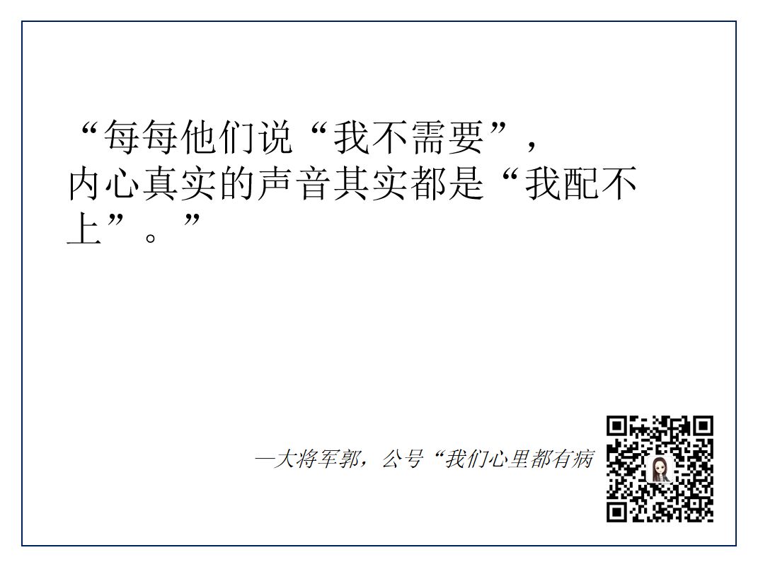 他们的核心信念也可以总结为一句话——“我配不上”,还有很多相似的表达,比如“我不值得”、“我没资格”、“我不应该得到”等等,表述不一,但都反应了一样的缺失和匮乏,他们没有“配得感”。
