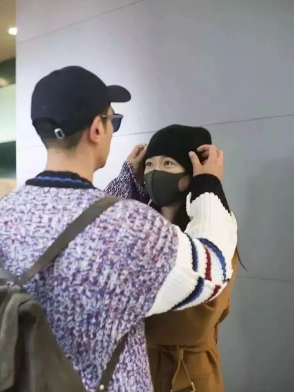 有次在机场路遇记者,毫无准备的霍思燕,不好意思地躲到了杜江怀里,他细心的帮她戴好帽子,将她呵护得宛若少女: