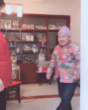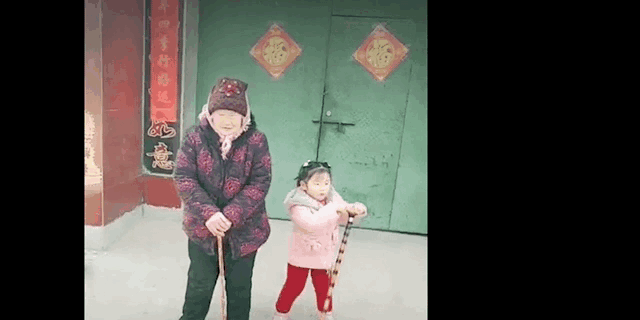 你回家了,她即使拄着拐杖,也会和小孙女一起扭呀扭……
