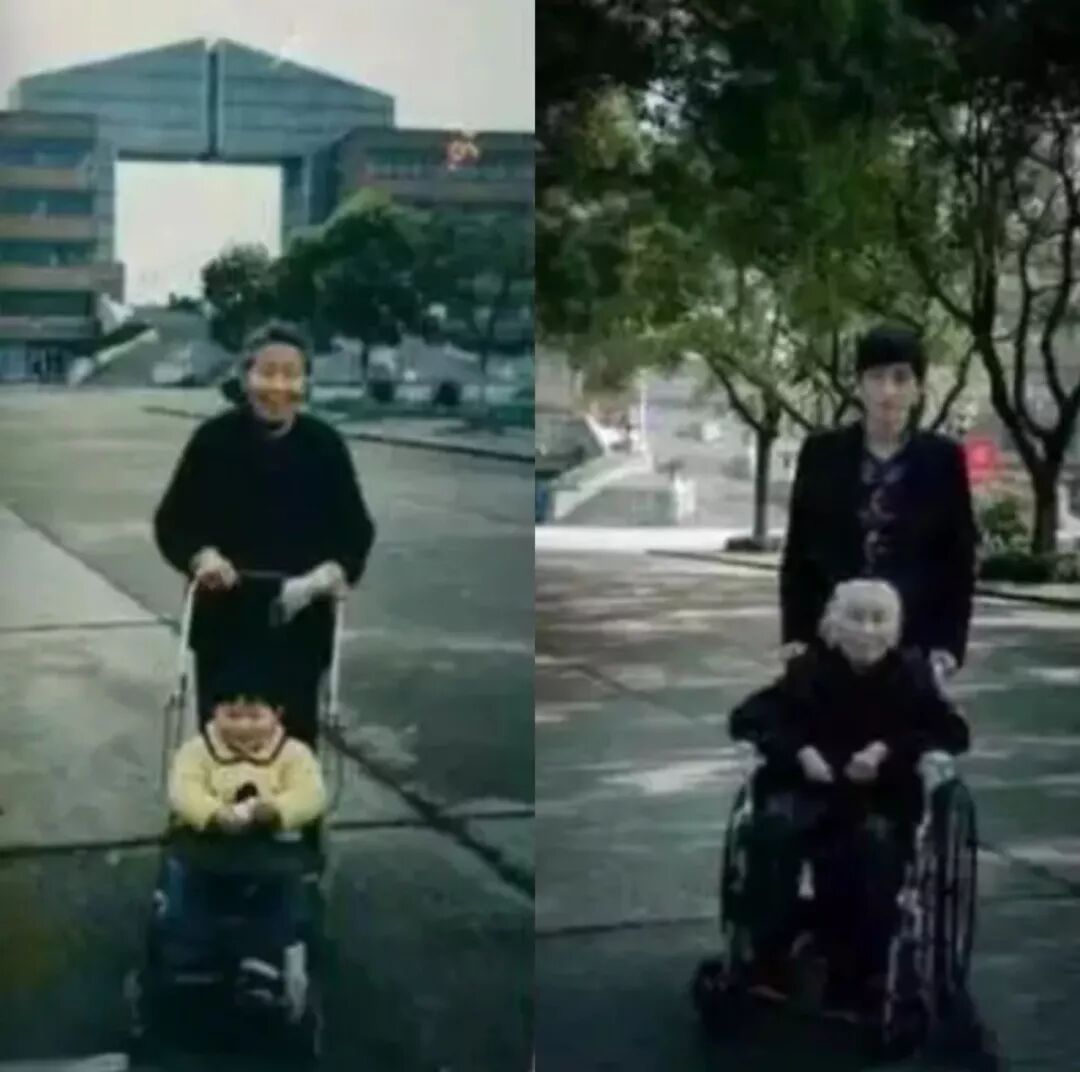 正如网友所说:二十年前,她推着你,二十年后,你推着她。