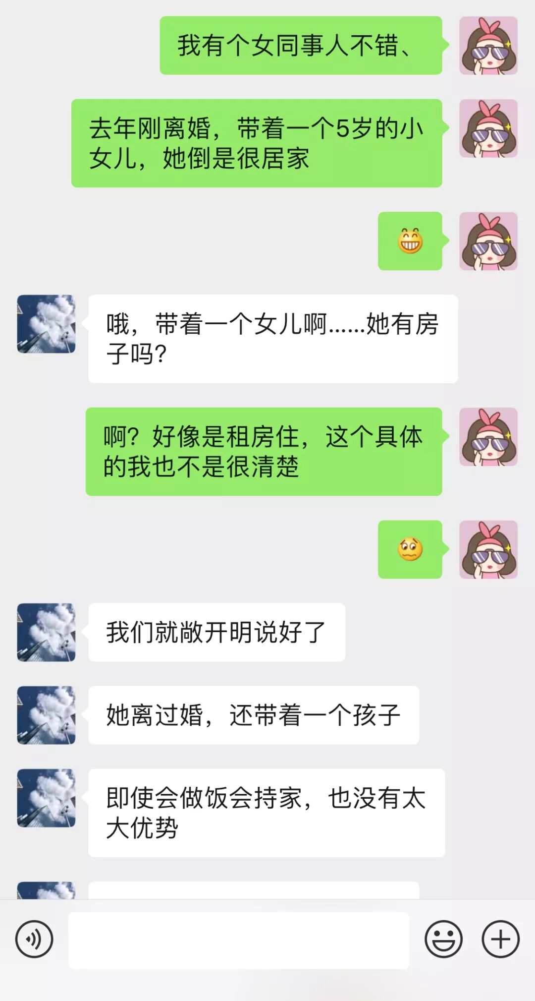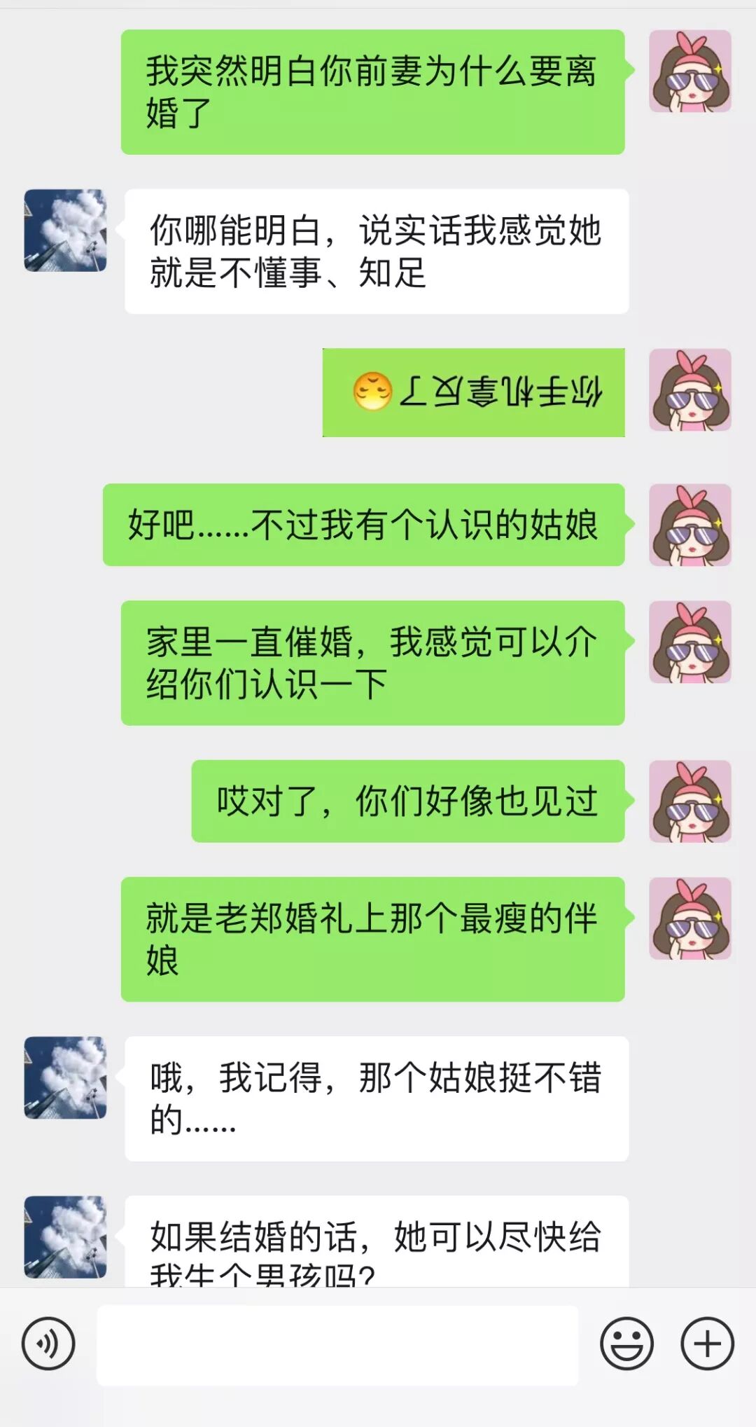 - 37岁离婚男相亲聊天记录曝光: 我月薪2万,娶个老婆生儿子怎么了?! 文|窈窕妈妈 图 | 来自网络 出处|窈窕妈妈(ID:iiimum) 一个离婚两年的男性朋友,托我帮他介绍一位女朋友。 他今