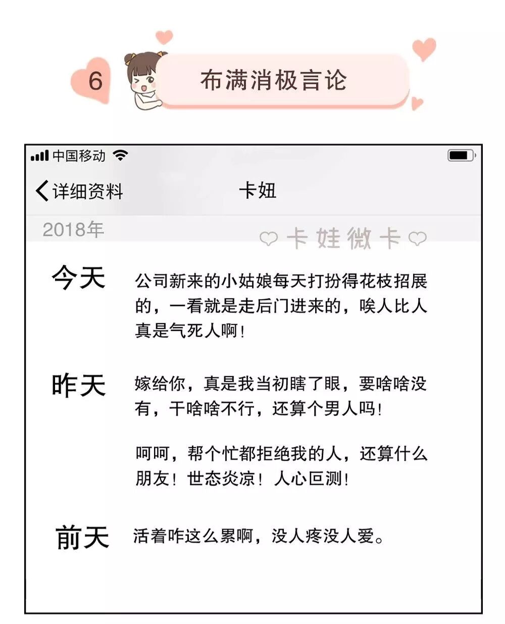 一个女人总在朋友圈发布消极言论,抱怨这抱怨那,说明她本身就是一个极度悲观和消极的人,她的生活也一定很不如意。遇到一点事就觉得天塌了,看什么都觉得不满意,也见不得别人的一点好,每天发这样的朋友圈的女人只会让人敬而远之。