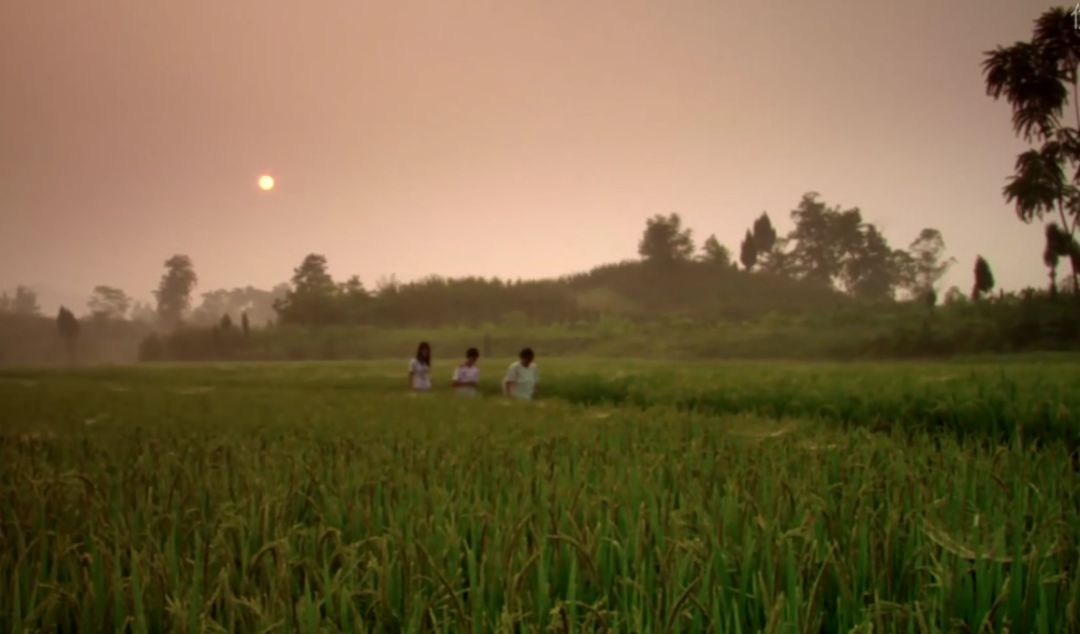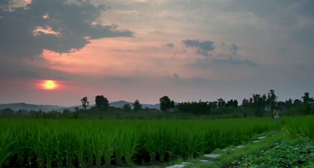 奶奶和小弟在家中水稻田里忙碌。爸爸和妈妈离开家乡回到广州。