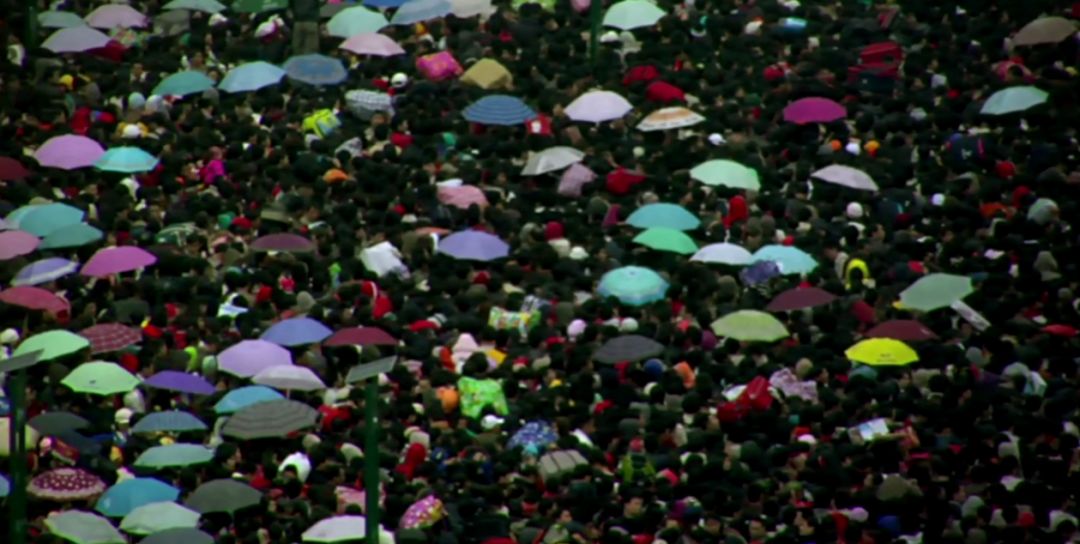人们等在火车站买票,从白天到晚上,下起了雨,有伞的人撑着伞,没伞的便生生淋着雨。