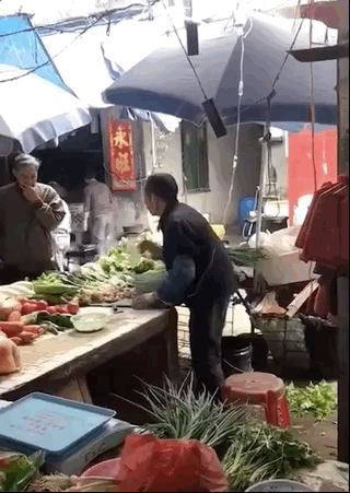 一位卖菜老父亲,生病打着点滴,却依然坚守在自己的摊位上。