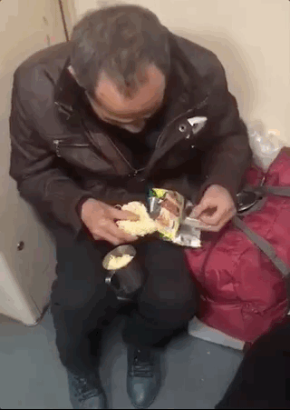 在列车的角落里,一位父亲为了省下饭钱,正打算吃自己带的泡面。