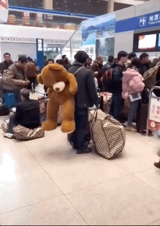 在火车站,一位等着回家过年的父亲背着一只玩具熊,等待回家的列车。