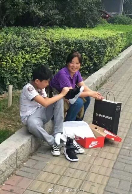 看着儿子试穿那双鞋子,妈妈幸福地笑了。