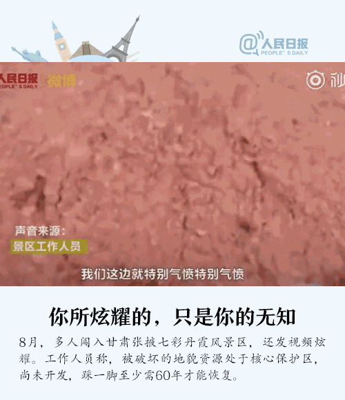 去年夏天,某音上有一段视频火了,两男一女闯入甘肃张掖市丹霞地貌风景区并拍摄视频,被破坏的地貌资源属于核心保护区,地貌形成需要上亿年,踩一脚至少需要60年才能恢复。