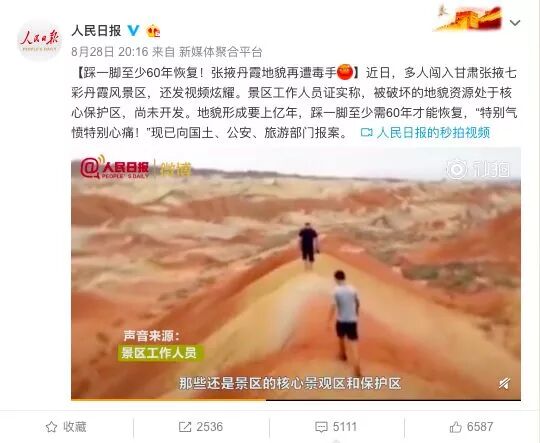 拍视频的人并非无知,他们在视频中说“我破坏了六千年的原始地貌”、“不是有一个新闻说踩了一脚,要用六十年恢复,我们几个不知道踩了好多脚,我还弄了点沙子”。