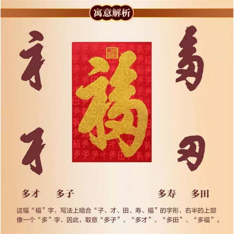 这个“福”字,可拆解析为:多子、多田、多才、多寿、多福,誉为“五福合一”、“福寿合一”。其字体瘦长,故又称“长寿福”。再加“康熙御笔之宝”大红印玺加盖上方,取意“鸿运当头、福星高照、天赐洪福”。