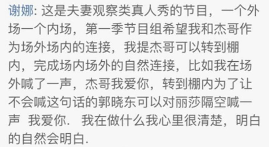 谢娜则委屈地解释说,她多次提到张杰是为了节目需要,这样可以完成场内场外的转换,并且安慰大家“如果我做啥你们都会替我担心的话,也太不了解我啦”。