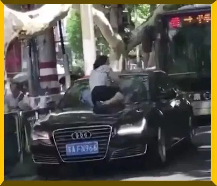 南京一辆奥迪汽车的挡风玻璃上,趴着个女人,而车里则有一男一女。