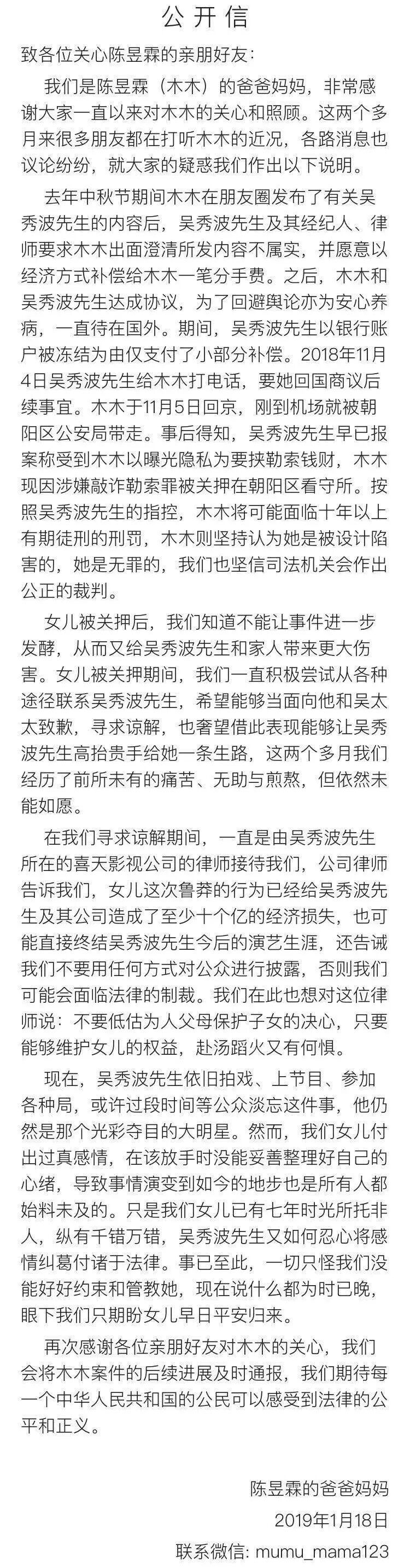 对此,吴秀波直接用律师信回应:陈昱霖父母的公开信属于不实信息,已经反映给公安机关。