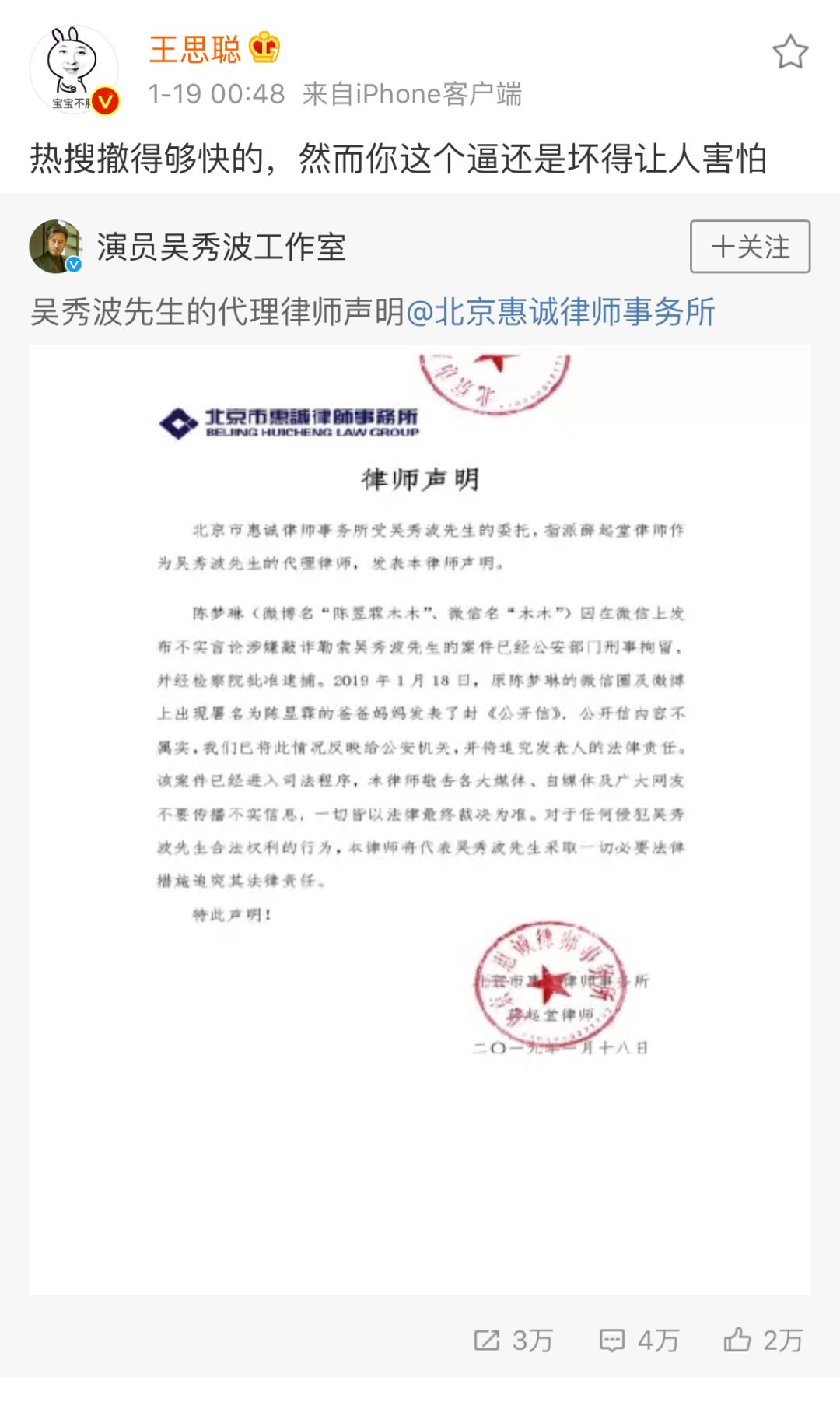去年陈昱霖发朋友圈以后,吴秀波及其经纪人要求她出面澄清“内容不实”;