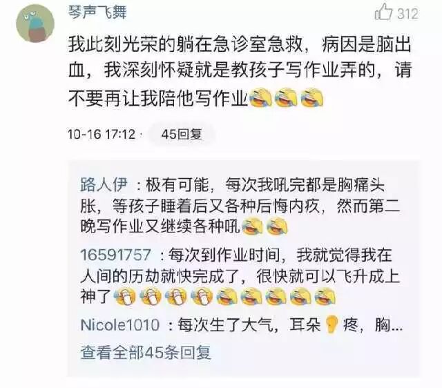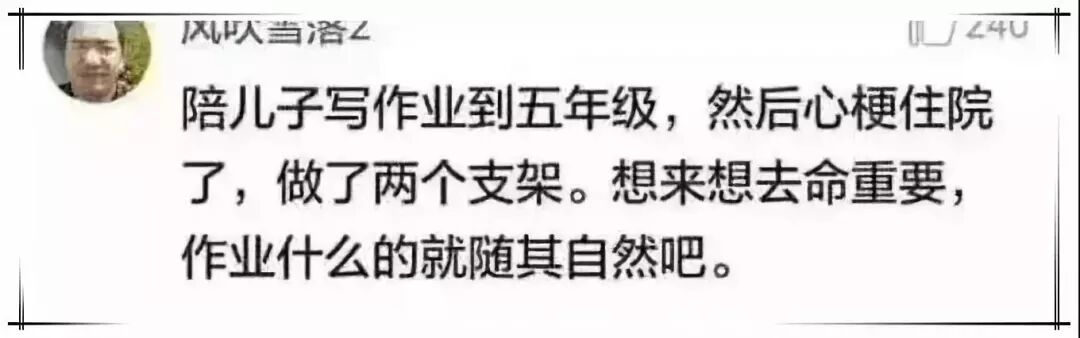 还有家长陪孩子写作业写到心梗住院,心脏搭桥的,这位家长说:“想来想去命重要,作业什么的就随其自然吧”。