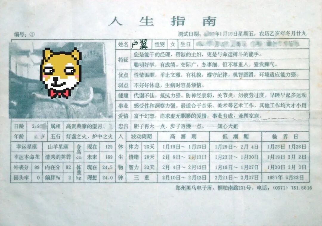 恩,今天是大摩羯一姐我的生日,晚上收到了老爸发来的这张20年前做的“人生指南”测试结果。