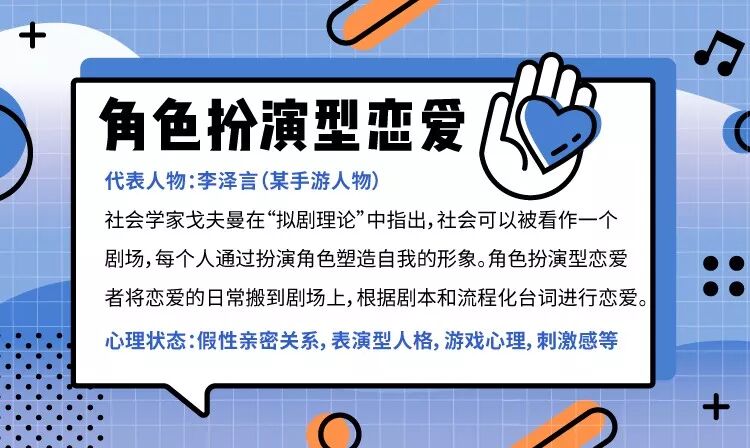 社会学家戈夫曼在“拟剧理论”中指出,社会可以被看作一个剧场,每个人通过扮演角色塑造自我的形象。角色扮演型恋爱者将恋爱的日常搬到剧场上,他们很少完全展示真实的自我,像剧本人物一样恋爱。