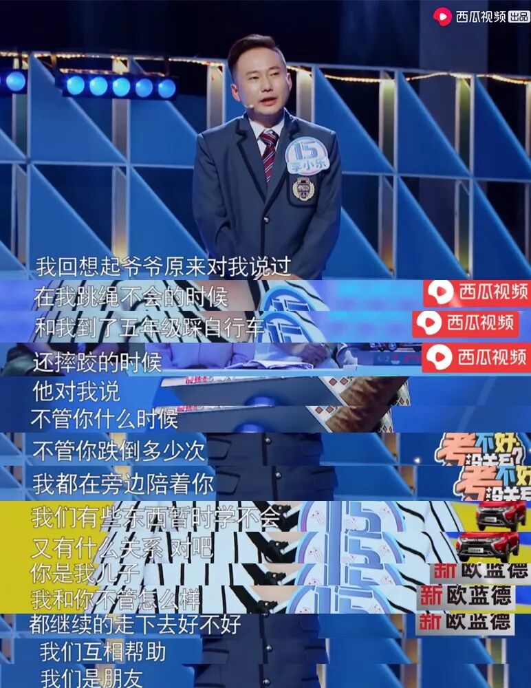 在答题失败后他对儿子李拜天说起自己小时候学不会跳绳和踩自行车老是摔跤的事。