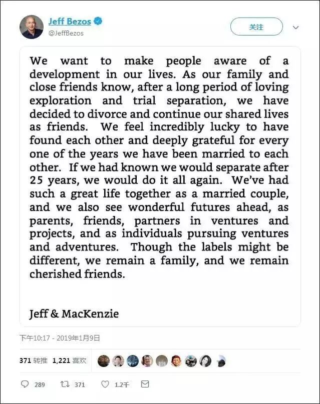 尽管后来我们知道,贝索斯是在婚内出轨自己朋友的老婆而选择结束婚姻。