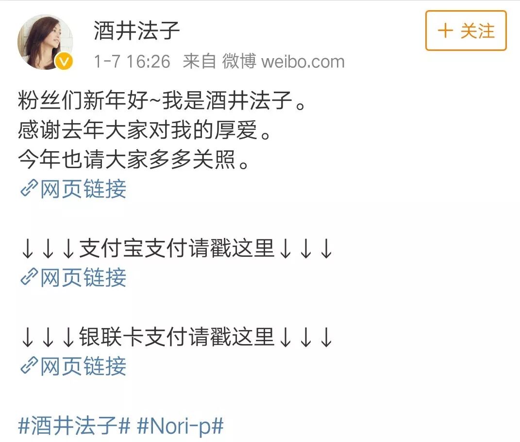 原是数月不推送的酒井法子,发了份迟来的新年祝福,客套几句后,贴心地为中国粉丝附上了注册粉丝网站会员的支付宝链接,如果不用支付宝也没关系,银联卡链接也有。