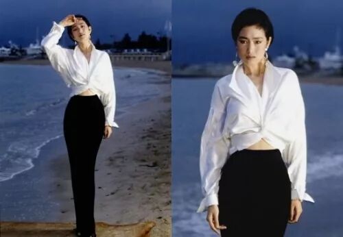 还有巩俐随《霸王别姬》团队去戛纳电影节,搭配的这身白衬衫、黑西裤的经典造型,成为多年来后继女星难以超越的经典。