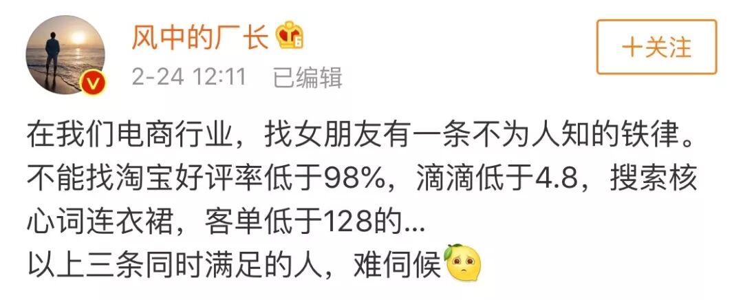 原来是一条爆了的微博提出了“找女友铁律”,其中有一个标准就是“淘宝搜索客单价不低于128元”,因为这样的女孩难伺候,言下之意,连衣裙不超过128元的姑娘,是活该单身咯?