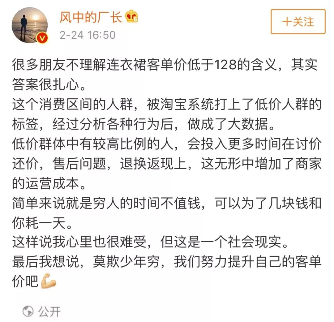 后续博主又解释了128元的含义,他们是淘宝系统定义的低价人群,会投入更多时间讨价还价、售后问题和退还折现上,博主直戳心窝的总结是“穷人的时间不值钱”。