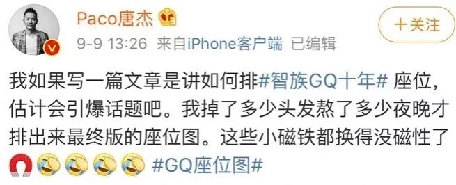这次智族GQ十周年的庆典,出版人唐杰亲自安排每个嘉宾的座位。