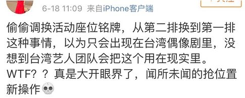 台湾艺人偷换座位铭牌,从第二排换到了第一排,这种骚操作简直闻所未闻。