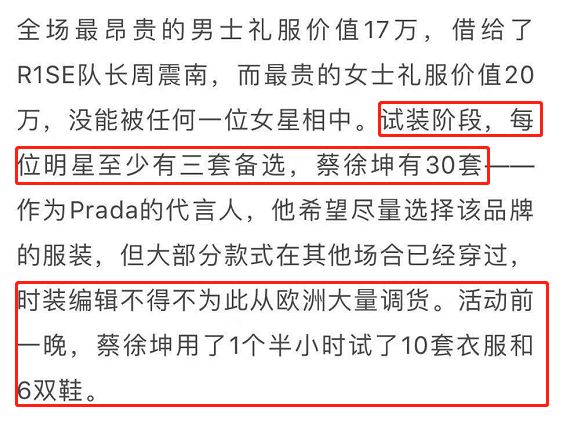 直到活动前一晚,蔡徐坤试了10套衣服和6双鞋。
