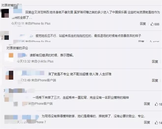 现场视频曝光后,有不少网友心疼这些超模,理解模特们的摔倒与现场客观因素有关。但也有不少网友指出,这些都是考验模特专业性的细节,不管什么样的服饰、鞋子,专业的模特都应该hold住。