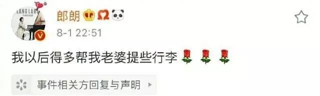随后,郎朗迫于舆论的压力,也对此事进行了回应,发文称,“我以后得多帮老婆提些行李。”