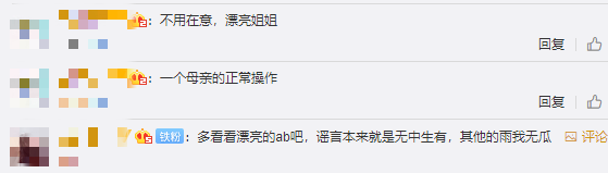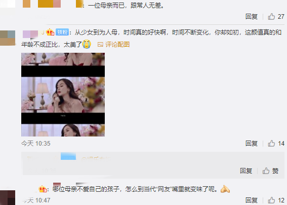 粉丝也为Baby打抱不平,哪位母亲不爱自己的孩子,怎么到了有些人眼里,Baby对孩子的爱就变味了呢?“一个母亲而已,跟常人无异”、“不用在意,漂亮姐姐”。