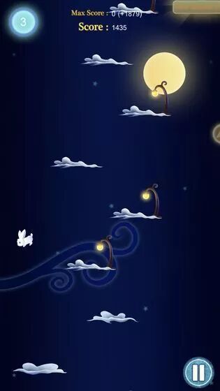 这是款画风唯美的跳跃游戏,灵感来源于嫦娥奔月,这里变成小兔子奔月。通过重力感应,控制小兔子左右移动,点击屏幕小兔子往上跳跃,踩在更高的云朵上,如果踏空掉下来,则进行另外一个吃小星星游戏,直到回到地面。