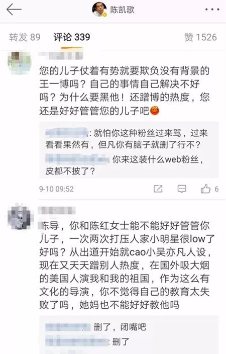 但也有一部分粉丝对于陈飞宇的手滑显得很愤怒,不仅在微博破口大骂,有的甚至跑到了陈凯歌微博下面,说他教子无方↓ 但鹅妹去看了下,目前这些评论都已经删除了。