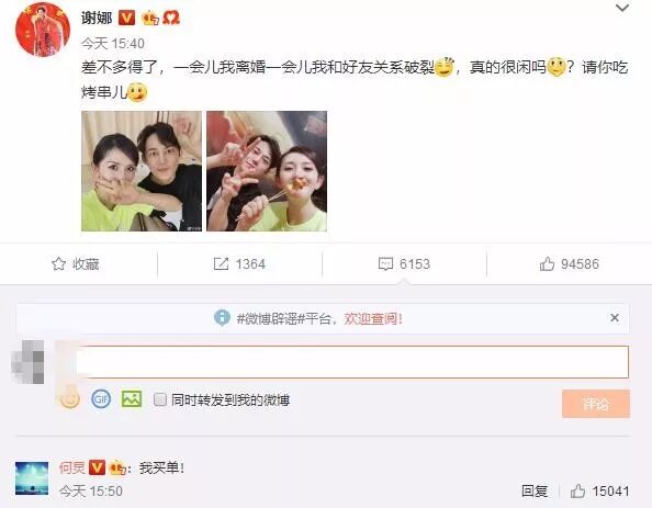 今天下午,谢娜发微博否认与何炅关系破解:“差不多得了,一会儿我离婚一会儿我和我好友关系破裂,真的很闲吗请你吃烤串。”何炅第一时间回复,打破关系破裂传闻。