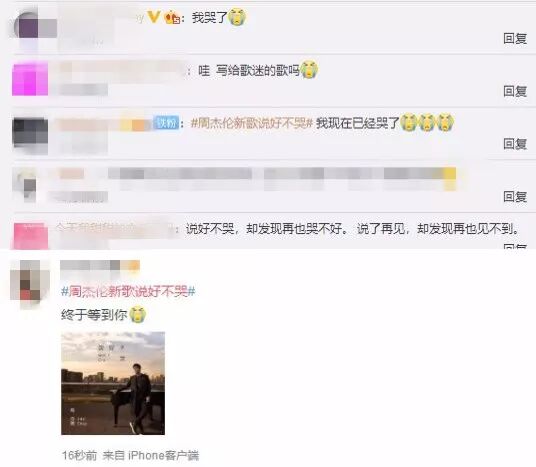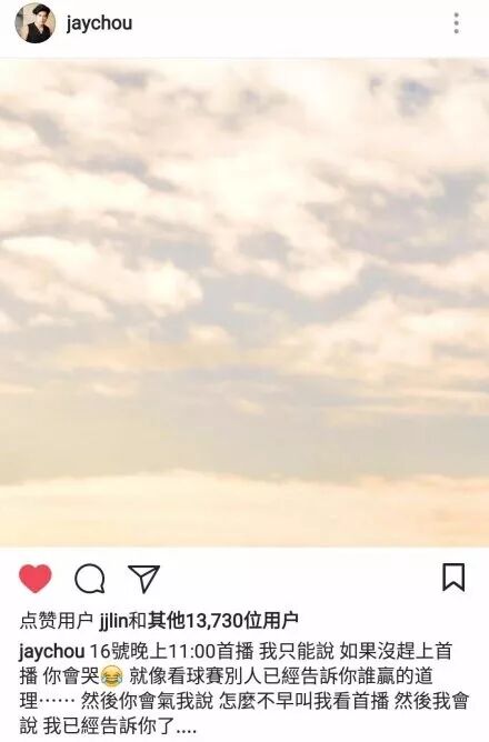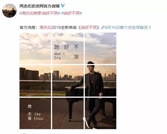 今天,周杰伦在个人社交网站上传了九宫格照片宣告新歌歌名《说好不哭》,并且再次预告将于16号晚上11:00公开新歌。周杰伦配文说:“16号晚上11:00首播,我只能说,如果没赶上首播的话你会哭哦!就像看球赛别人已经告诉你谁赢的道理......然后你会气我说‘怎么不早叫我看首播’,然后我会说,我已经告诉过你了...”这么傲娇的文案,果然是我们杰伦小公举!