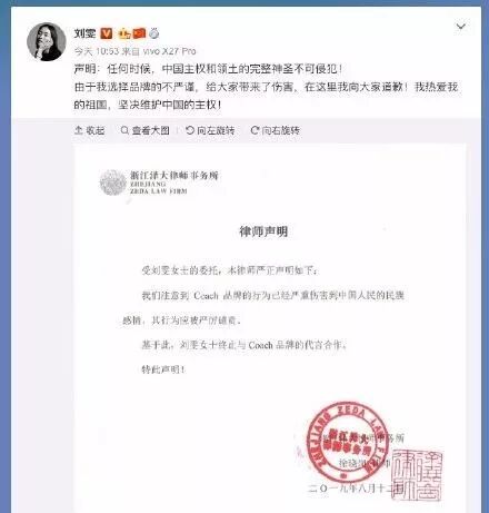 此前,与刘雯签约的服饰品牌coach曝出在衣服上印制侵犯中国领土完整的图案,刘雯得知后马上与该品牌解约,表明自己的爱国立场,捍卫国家统一,当时此举获得网友们的一片称赞。