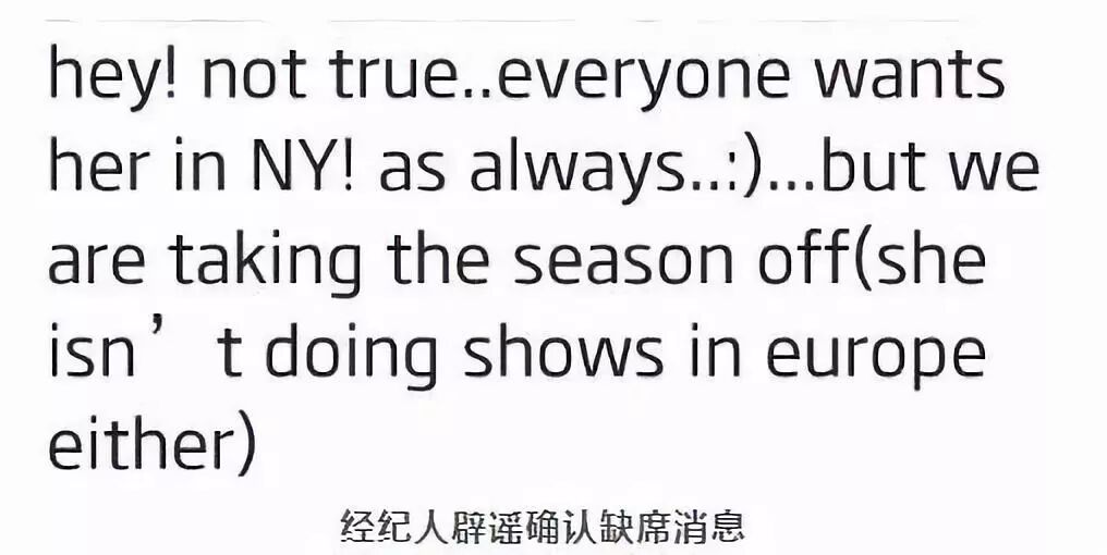 爆料中,刘雯国外的模特经纪人在回复网友的评论中说道:大家都像以往一样希望她能出现在纽约(时装周),但我们这一季会缺席。经纪人还表示欧洲的时装周也不会出现。网友们也纷纷猜测或许因为此前品牌事件影响。