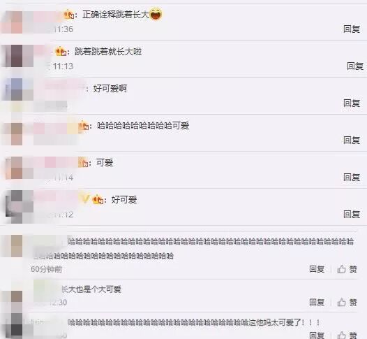 粉丝们被逗笑的同时大呼可爱:“长大也是个大可爱”、“跳着跳着就长大啦”。